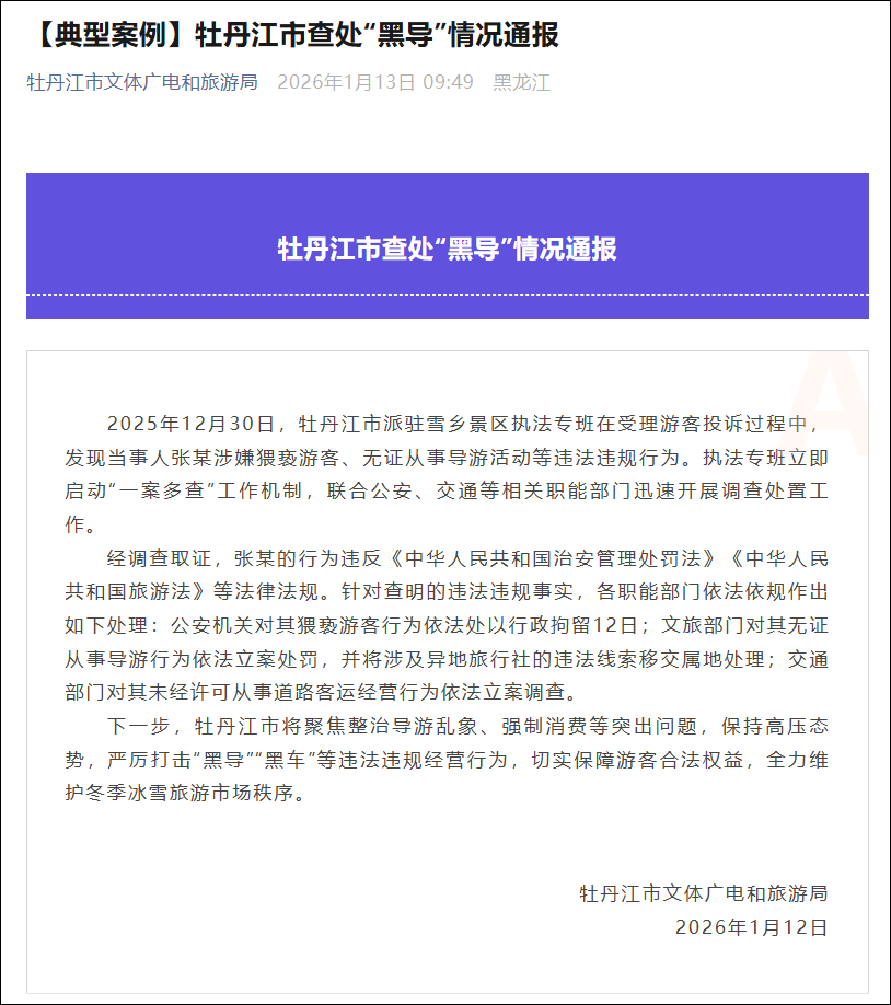2025年12月30日,牡丹江市派驻雪乡景区执法专班在受理游客投诉过程中,发现当事人张某涉嫌猥亵游客、无证从事导游活动等违法违规行为。执法专班立即启动“一案多查”工作机制,联合公安、交通等相关职能部门迅速开展调查处置工作。