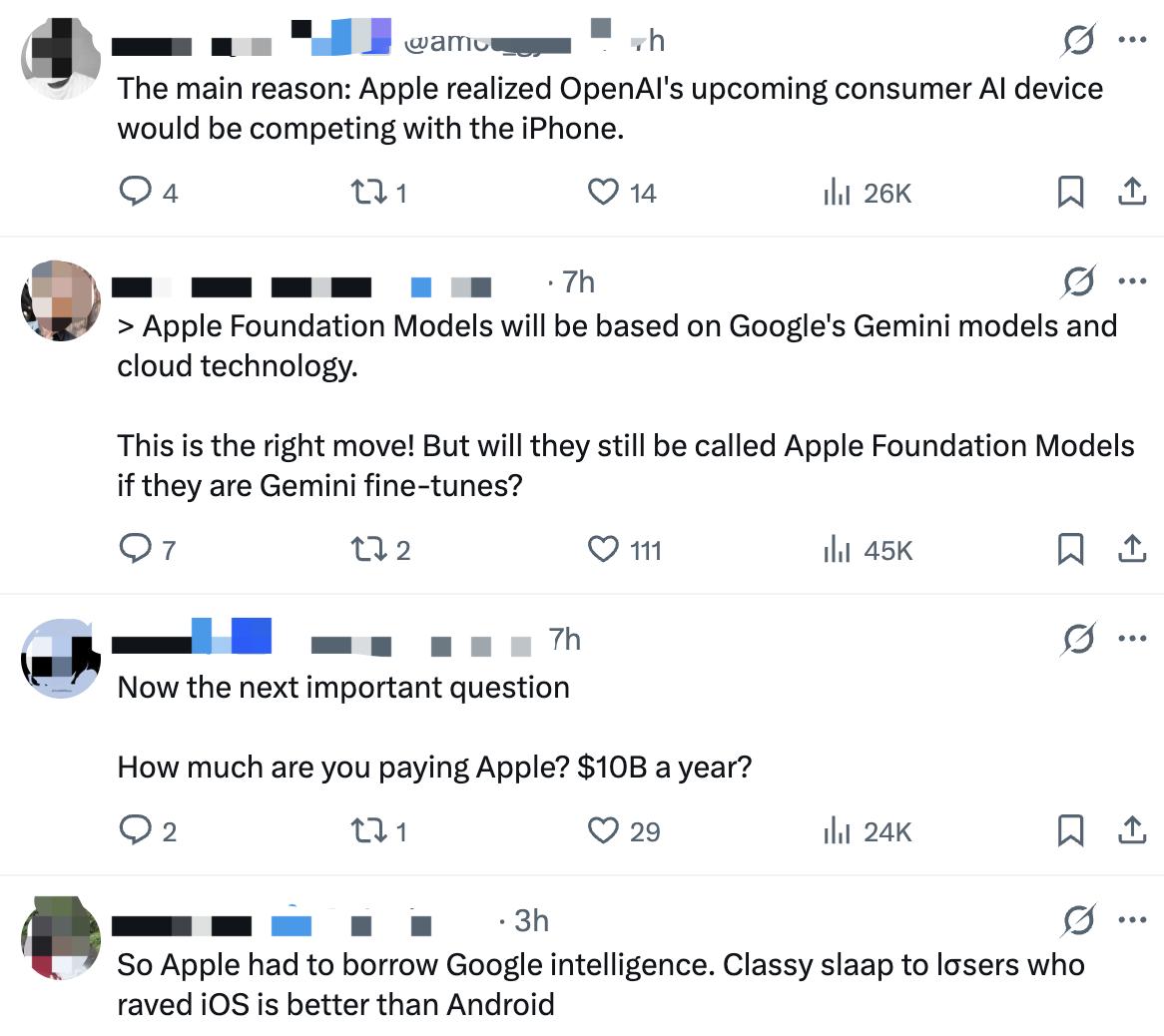 对于这场世纪牵手,广大网友也各执一词。有网友认为“(合作)这是正确的举措”,但依然发出犀利的提问:“如果他们是对Gemini模型的微调,还能叫苹果基础模型吗?”有人直指:“这真是对那些吹捧iOS比安卓更好的失败者们的漂亮反击。”