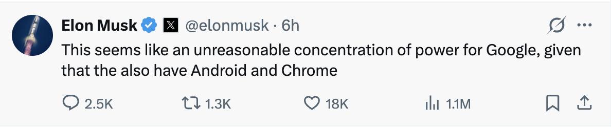 消息一经发布,马斯克跳出来在社交平台X直言:“考虑到谷歌旗下还拥有安卓和Chrome浏览器,这种权力集中似乎有些不合理。”
