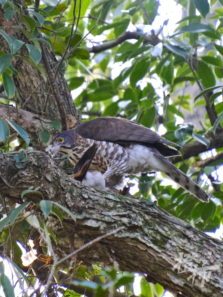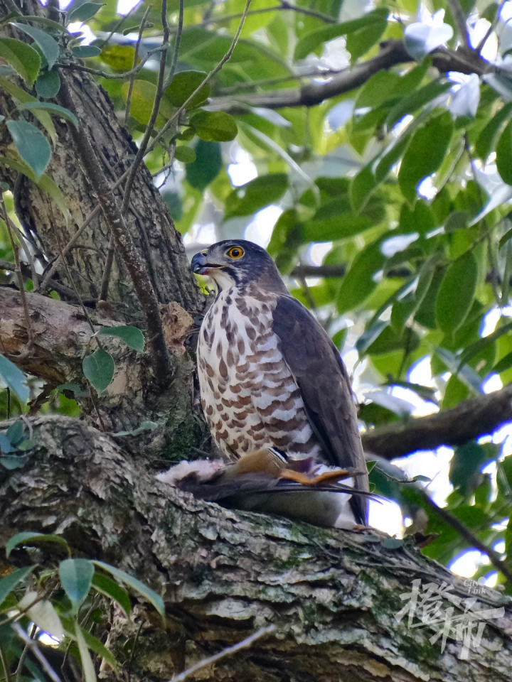 李峰说,“在杭植偶遇凤头鹰进食!不知道是哪位鸟卿成了阿凤的午餐,看花纹有点像雄性鸳鸯。好可怜。”
