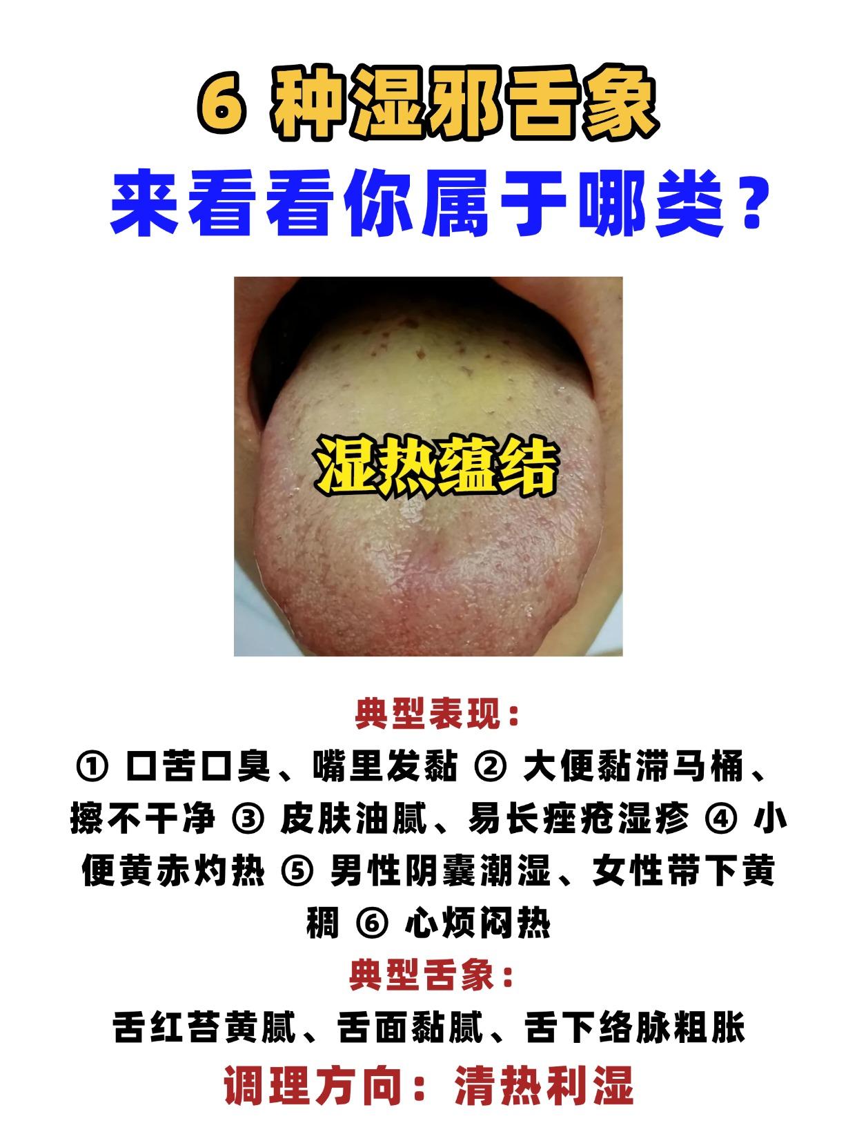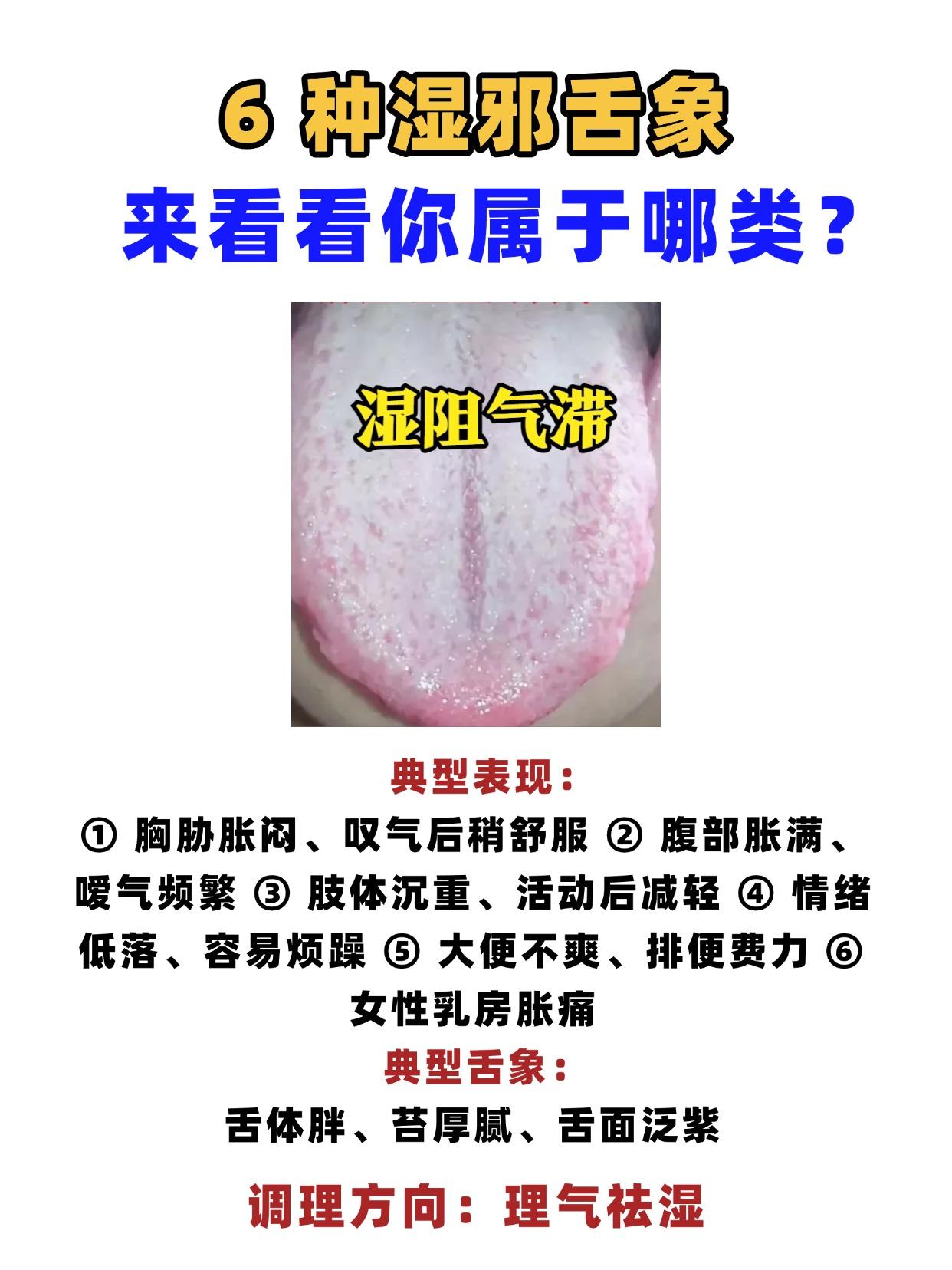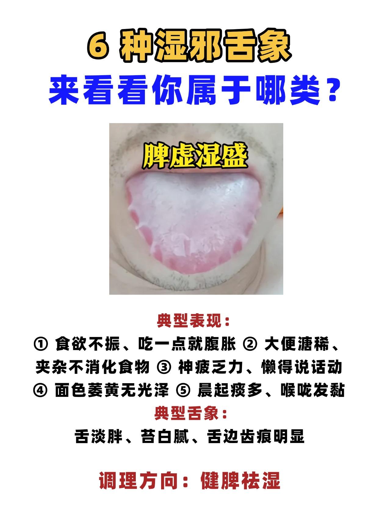 6种湿邪舌象,来看看你属于哪类? 一、寒湿困脾 典型表现:怕冷怕凉,吃生冷就腹胀,大便稀溏不成形,四肢沉重,发懒,口淡无味、不想喝水,关节酸痛沉重,小便清长,量多 典型舌象:舌体胖大、舌苔白腻、舌边齿痕 调理方向:温化寒湿 二、湿热蕴结 典型表现:口苦口臭、嘴里发黏,大便黏滞马桶、擦不干净,皮肤油腻、易长痤疮湿疹,小便黄赤灼热,男性阴囊潮湿、女性带下黄稠,心烦闷热 典型舌象:舌红苔黄腻、舌面黏腻、舌下络脉粗胀 调理方向:清热利湿 三、脾虚湿盛 典型表现:食欲不振、吃一点就腹胀、大便溏稀、夹杂不消化食物,神疲乏力、懒得说话动,面色萎黄无光泽,晨起痰多、喉咙发黏 典型舌象:舌淡胖、苔白腻、舌边齿痕明显 调理方向:健脾祛湿 四、湿阻气滞 典型表现:胸胁胀闷、叹气后稍舒服,腹部胀满、嗳气频繁,肢体沉重、活动后减轻,情绪低落、容易烦躁,大便不爽、排便费力,女性乳房胀痛 典型舌象:舌体胖、苔厚腻、舌面泛紫 调理方向:理气祛湿 五、湿浊犯肺 典型表现:咳嗽痰多、痰白黏稠易咳出,胸闷气短、呼吸不畅,咽喉不利、总觉得有痰黏着,容易感冒、感冒后痰多难愈,晨起咳痰加重,身体困重、懒得动 典型舌象:舌淡红、苔白腻、舌尖偏红 调理方向:宣肺祛湿 六、水湿泛滥 典型表现:全身浮肿、按之凹陷不起,腹部胀满如鼓,畏寒肢冷、手脚冰凉,小便短少不利,气短喘促、活动后加重食欲极差 典型舌象:舌体极度胖大、苔白滑、舌面水滑 调理方向:温阳利水