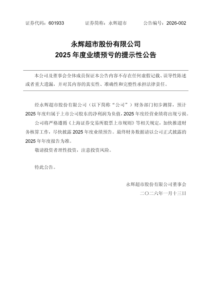1月13日早间,永辉超市(601933.SH)发布业绩预告,预计2025年全年净利润为负,这家曾被誉为“超市一哥”的企业,自2021年以来连续净利润亏损,累计亏损已超百亿元。