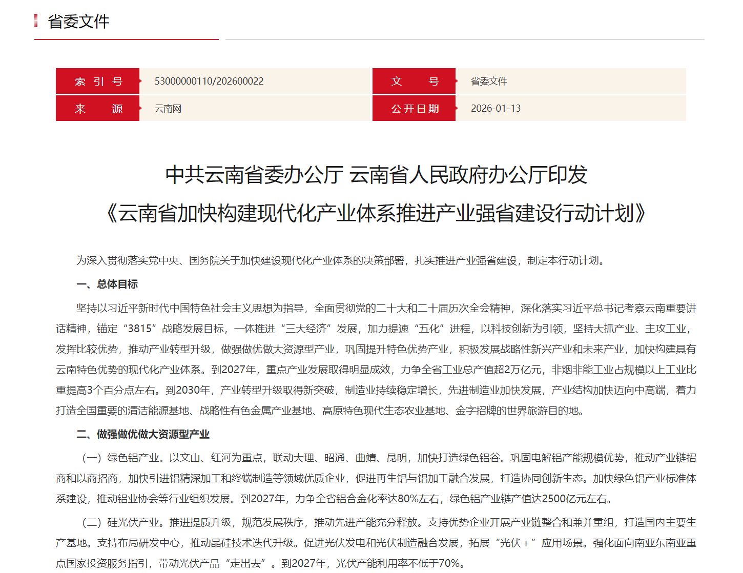 1月13日,中共云南省委办公厅、云南省人民政府办公厅印发《云南省加快构建现代化产业体系推进产业强省建设行动计划》。