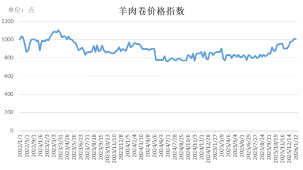 新华指数研究院山西中心监测,截至1月12日,与上期(1月5日,下同)相比,怀仁活羊、羊胴体及羊肉卷价格均持续上涨。