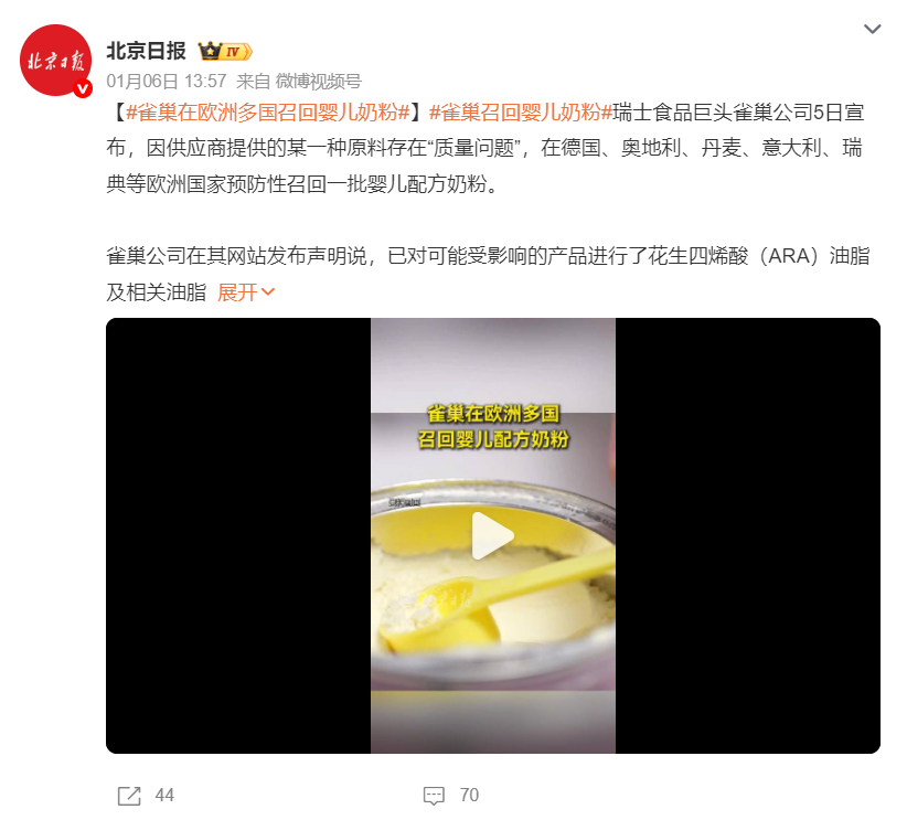 近日,雀巢全球发布声明称,由于供应商提供的ARA或涉及质量风险,将在全球31个国家和地区预防性召回部分批次的婴幼儿配方奶粉。之后,雀巢中国也公布了相应的召回清单。