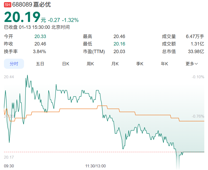 回应次日,嘉必优盘中一度跌14.62%至20.5元/股,股价创2025年4月10日以来约9个月新低。截至1月13日收盘,嘉必优股价报20.19元/股,跌1.32%,总市值33.98亿元。