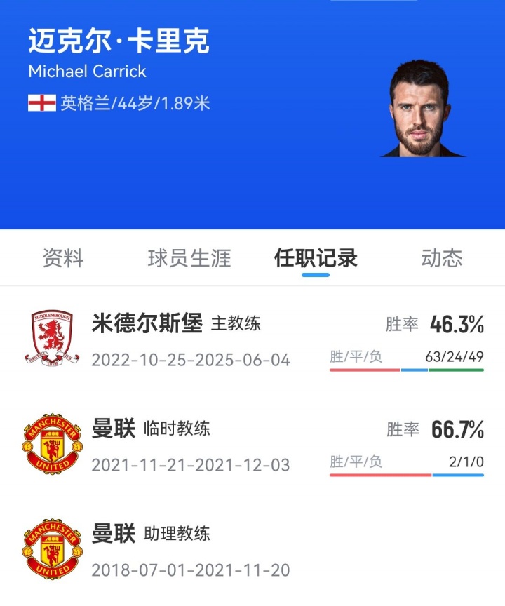 卡里克球员时期在曼联效力12年,2018年在曼联退役后就在球队担任助教,辅佐索尔斯克亚。2021年索尔斯克亚下课后,卡里克担任临时主帅带队3场,曼联取得2胜1平的战绩,之后朗尼克接手曼联,卡里克也离开了教练组。