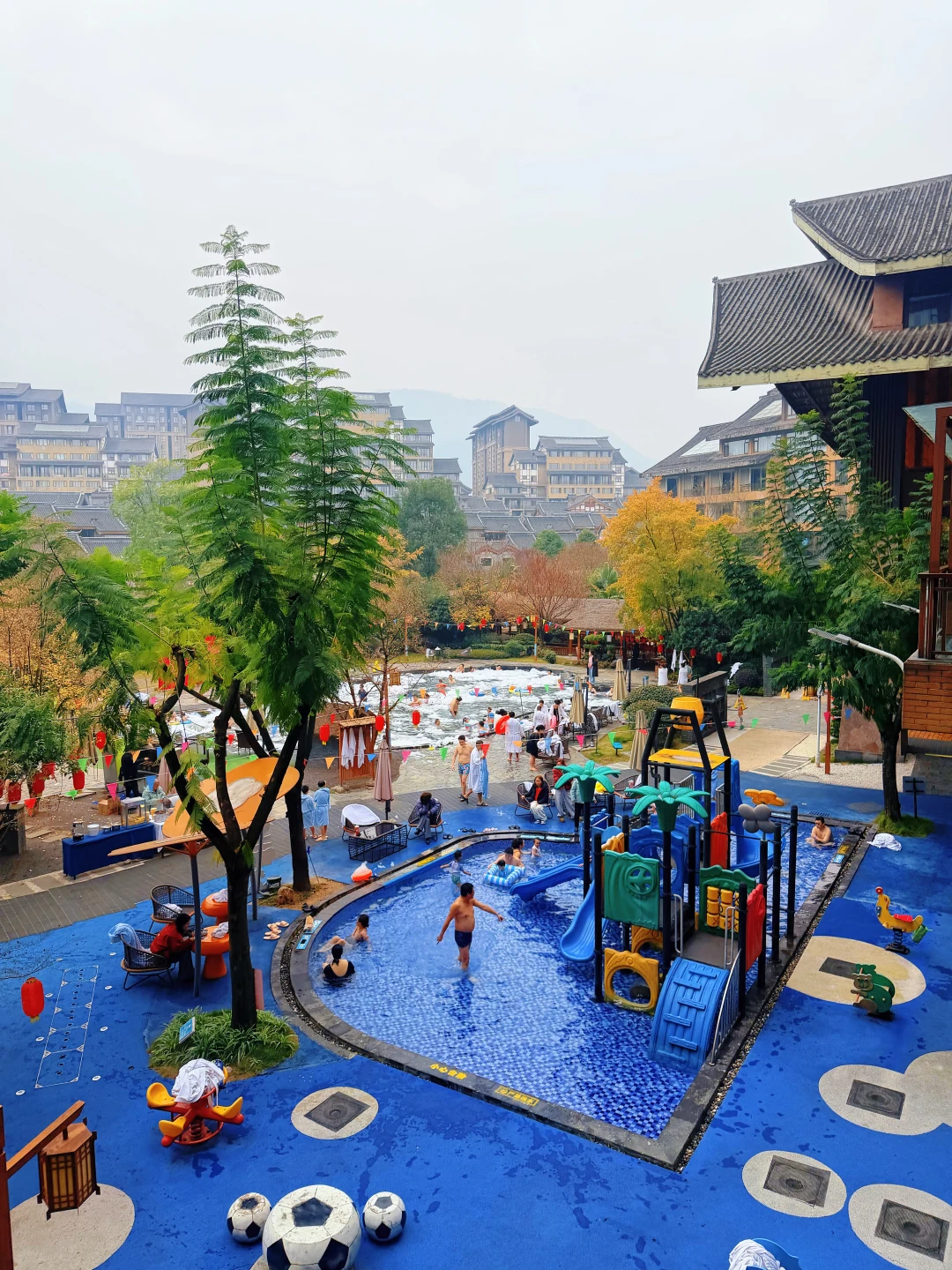 💛室外玩法更丰富,专属儿童滑梯池,水温恒定在38-40℃,旁边还有漩涡池、莲花🪷池、红酒池可等,无边泳池更是拍照超出片~