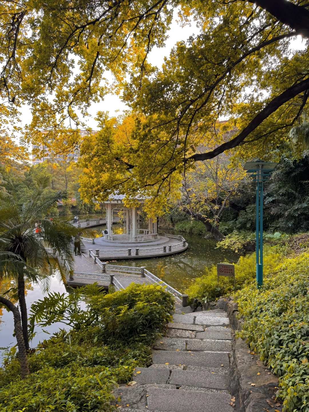 🔹荷风亭:从秀丽湖牌坊进去往左边走几十米就看到有个灰色凉亭,凉亭旁朴树的叶子还不怎么黄,打算拍黄叶的小伙伴们可以等一两个星期再过来