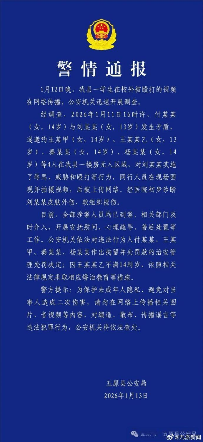 经调查,2026年1月11日16时许,付某某(女,14岁)与刘某某(女,13岁)发生矛盾,遂邀约王某甲(女,14岁)、王某某乙(女,13岁)、秦某某(女,14岁)、杨某某(女,14岁)等4人在我县一楼房无人区域,对刘某某实施了辱骂、威胁和殴打等行为,同行人员在现场围观并拍摄视频,后被上传网络。经医院初步诊断刘某某皮肤外伤、软组织挫伤。