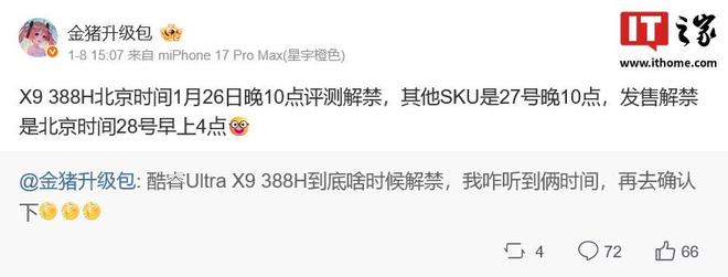 在英特尔的酷睿Ultra(第三代)处理器方面,笔记本电脑消息人士@金猪升级包在其微博动态中表示,旗舰型号酷睿UltraX9388H将于北京时间1月26日22:00评测解禁、其余型号1月27日22:00评测解禁,发售解禁时间是1月28日04:00。