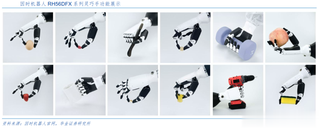 除上述整机厂外,还有大量零部件厂布局灵巧手,因时机器人的末端执行器包含RH56BFX系列、RH56DFX系列、RH56E2系列灵巧手以及EG2-4B系列和EG2-4C系列伺服电动夹爪。其中RH56DFX系列为仿人五指灵巧手,单指抓握力达到1.5kg,±0.2mm重复定位精度、0.5N力分辨率,另外整手重量仅540g。因时机器人的灵巧手可实现抓取鸡蛋、水果、杠铃、以及握持杯子、工具等动作,可满足精细化作业需求。