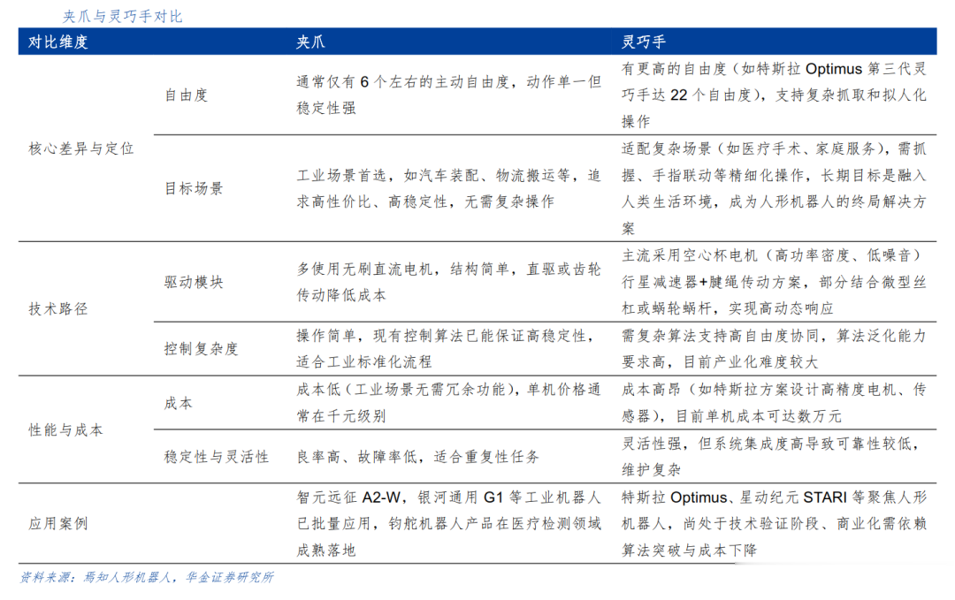 传统夹爪或抓持手已经在工业装配、医疗检测等领域实现应用,但由于其仅针对标准化流程进行设计,因此泛化能力有限。灵巧手结构与人手相似,具有高自由度、高精度等特点,可以与人形机器人搭配执行多种复杂任务,如抓握小型物体、搬运物品等,在工业场景、商业场景、家用场景中均有较大的应用潜力。