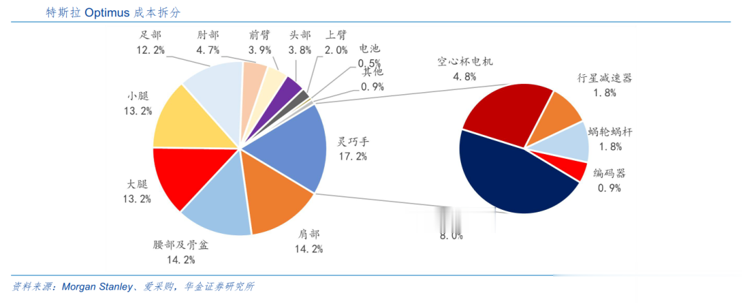 成本方面,灵巧手约占整机成本17%,成本层面灵巧手是整机最重要的部件之一。以特斯拉Optimus为例,从整机各部位的成本拆分来看,灵巧手成本占比约为17.2%,占最大比重,其中空心杯电机、六维力传感器分别占比4.8%、8.0%,行星减速器、蜗轮蜗杆、编码器分别占比1.8%、1.8%、0.9%,空心杯电机与六维力矩传感器是灵巧手中的核心部件。