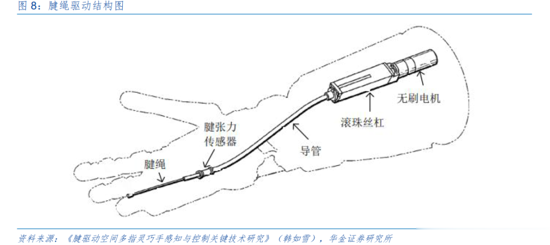 传动方式上,腱绳传动可实现远距离动力传递,灵巧手前臂中的电机通过齿轮箱驱动滚珠丝杠,通过滚珠丝杠上的螺母将旋转运动转化为直线运动,腱绳形成一个腱环套在螺母上,螺母拉动连接在灵巧手手指指骨上的腱绳,实现手指饶关节轴的转动运动。