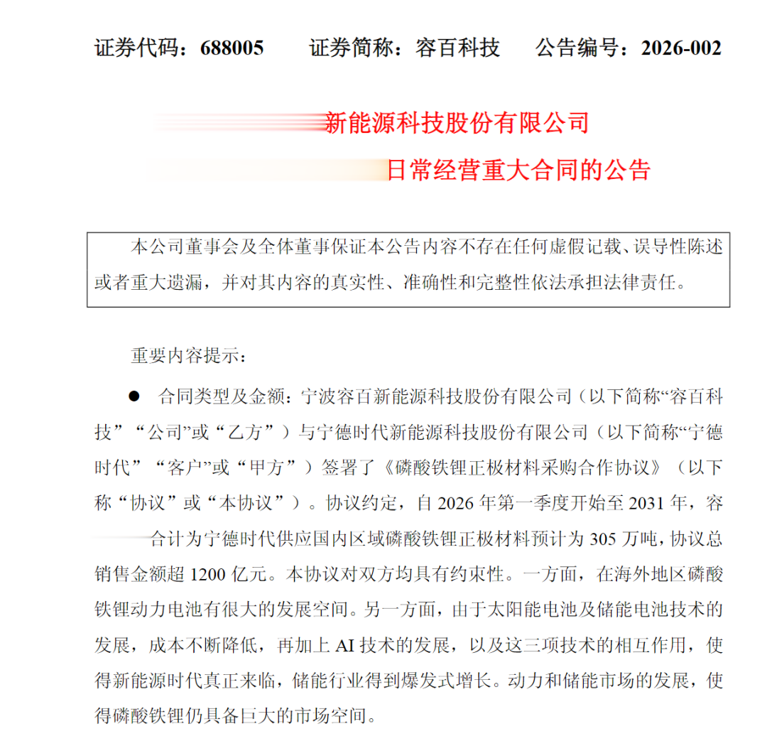 1月13日晚,容百科技(688005)披露,公司与宁德时代签署了《磷酸铁锂正极材料采购合作协议》。协议约定,自2026年第一季度开始至2031年,容百科技合计为宁德时代供应国内区域磷酸铁锂正极材料预计为305万吨,协议总销售金额超1200亿元。本协议对双方均具有约束性。