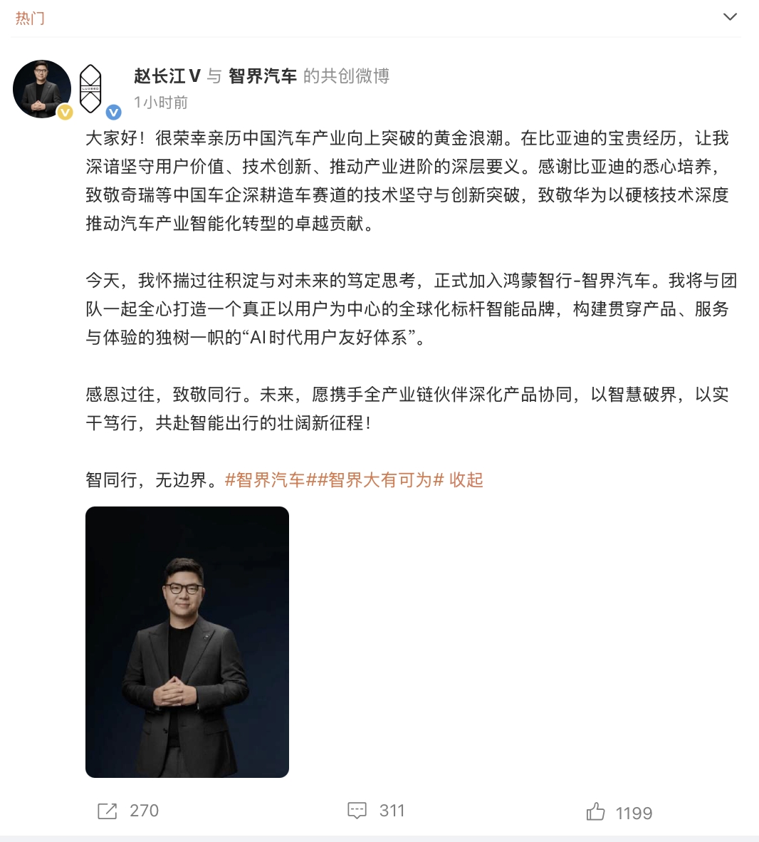 今天算是正式官宣,其微博认证已更新为智界执行董事&执行副总裁,并且发了一条微博,先是感谢前东家比亚迪的培养,又致敬了奇瑞和华为,最后表明自己正式加入鸿蒙智行-智界汽车,各方都照顾到了,格局拉满。
