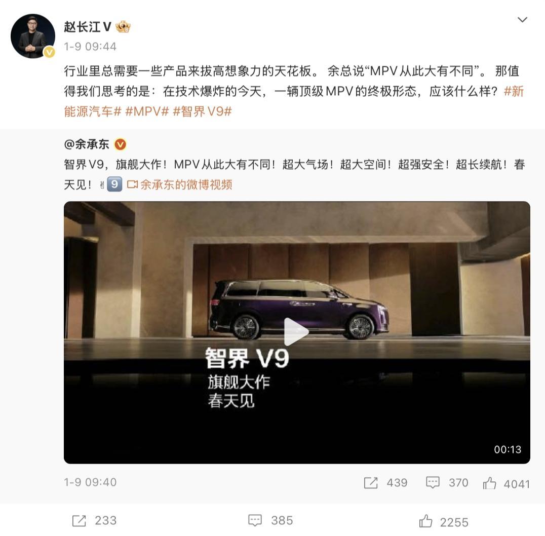 而据此前报道,赵长江加盟智界后主要负责营销工作,智界V9就是他的履新首战,这次官宣既是他的职场首秀,更是给即将上市的智界V9打了波顶级免费广告。