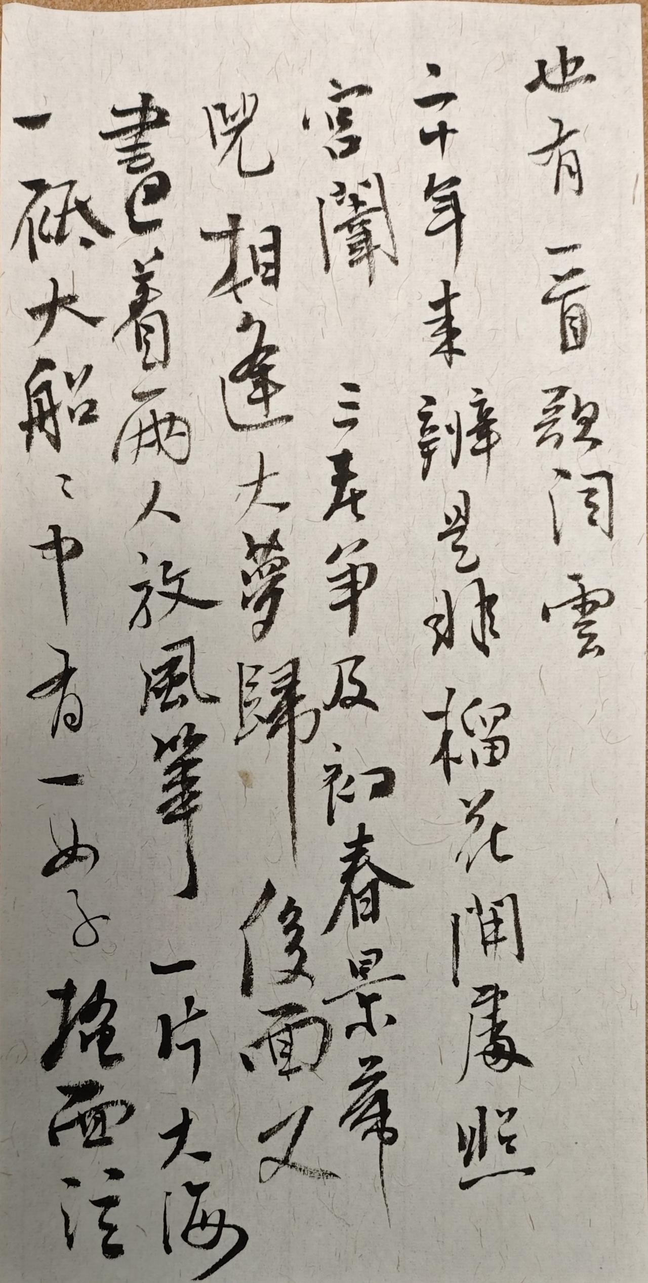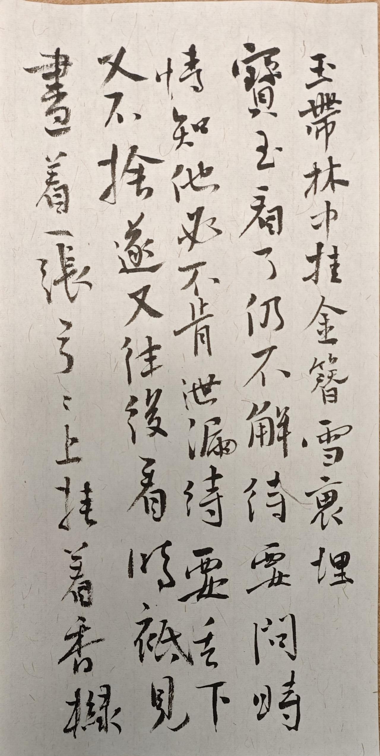 玉带林中挂,金簪雪里埋。宝玉看了仍不解。待要问时,情知他必不肯泄漏,待要丢下,又不舍。遂又往后看时,只见画着一张弓,弓上挂着香橼。也有一首歌词云: 二十年来辨是非,榴花开处照宫闱。 三春争及初春景,虎兕相逢大梦归。后面又画着两人放风筝,一片大海,一只大船,船中有一女子掩面泣涕之状。也有四句写云: 才自精明志自高,生于末世运偏消。 清明涕送江边望,千里东风一梦遥。后面又画几缕飞云,一湾逝水。其词曰: 富贵又何为,襁褓之间父母违。 练字静心随笔 书法练习打卡