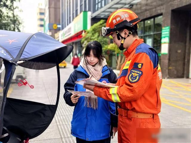“师傅,电动自行车千万不能进楼入户、不能飞线充电,危险得很哦……”为进一步增强辖区外卖配送员、电动自行车骑乘人员的消防安全意识,1月12日,余庆县消防救援大队组织“蓝焰黔行”红旗巡逻志愿服务队,为辖区外卖员和电动自行车骑乘群众送上消防“安全餐”。