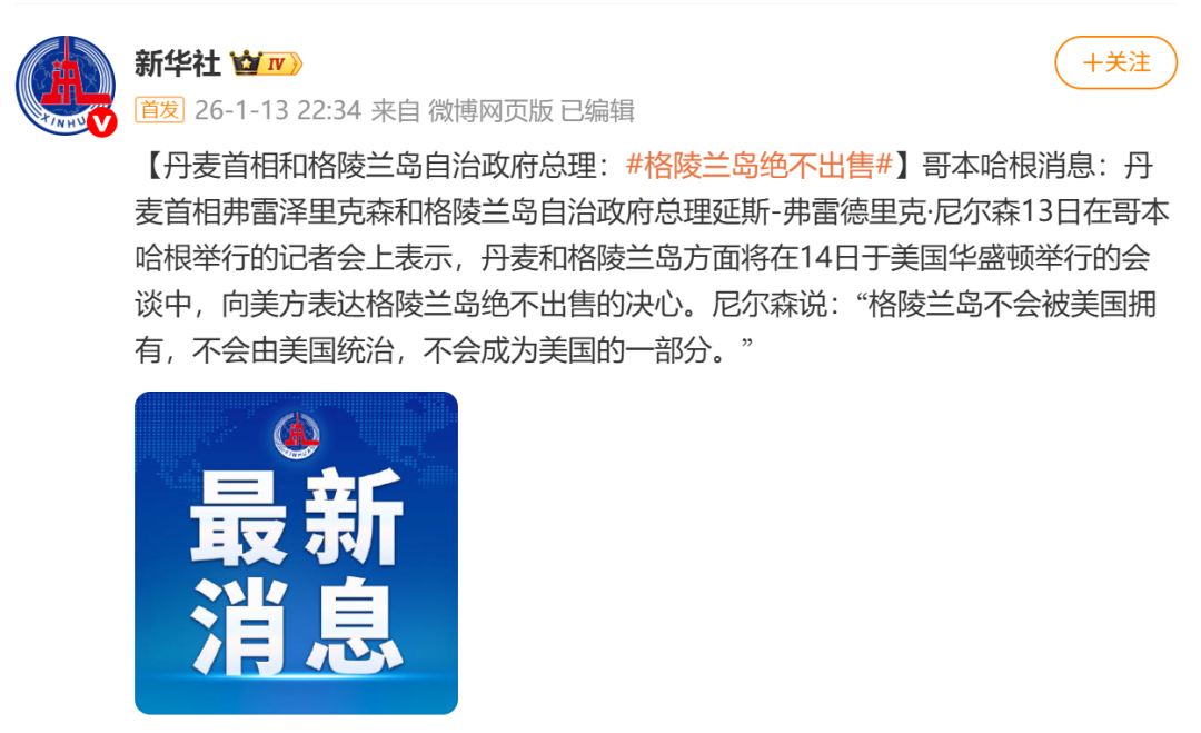 哥本哈根消息:丹麦首相弗雷泽里克森和格陵兰岛自治政府总理延斯-弗雷德里克·尼尔森13日在哥本哈根举行的记者会上表示,丹麦和格陵兰岛方面将在14日于美国华盛顿举行的会谈中,向美方表达格陵兰岛绝不出售的决心。尼尔森说:“格陵兰岛不会被美国拥有,不会由美国统治,不会成为美国的一部分。”
