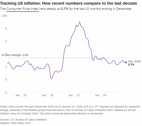 劳工统计局的数据显示,2025年年末,美国通胀率仍高于正常水平,但全年最终的消费者价格指数数据也表明通胀管控取得一定进展:12月整体通胀率和核心通胀率均为2.7%,分别低于1月的3%和3.3%。
