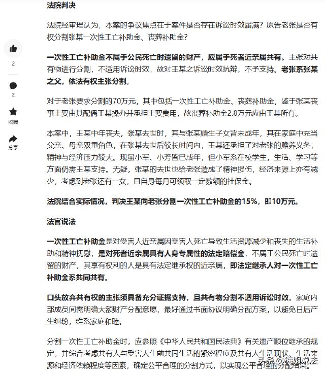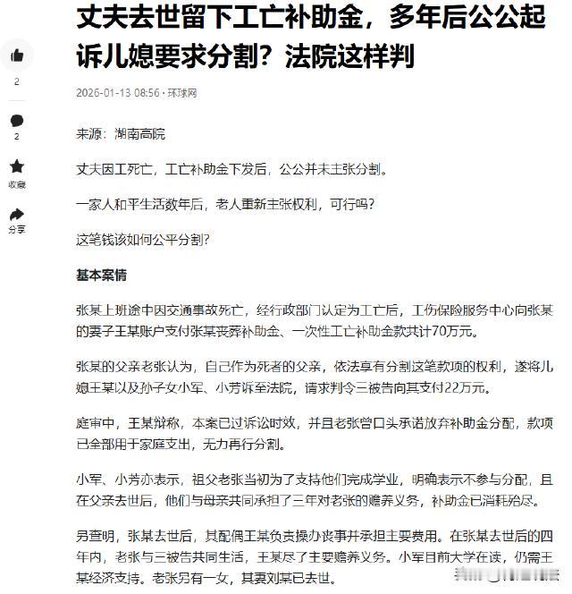 老人儿子车祸工亡获赔70万全打进儿媳卡里,多年后老人告上法院,让儿媳支付22万补助金。儿媳称公公曾承诺放弃分配且过了诉讼时效,孙女也表示钱已花完还赡养了爷爷。 (来源:环球网1月13日报道) 老张一直生活在农村,儿子张某是家里的顶梁柱,在城里找了份工作,努力打拼着。儿媳王女士温柔贤惠,和张某感情很好,还有一个可爱的女儿。一家人虽然不富裕,但也过得和和美美。 张某在上班途中遭遇了严重的车祸,送到医院时已经没了生命迹象。老张听到这个消息,整个人都懵了,瘫坐在地上,眼泪止不住地流。王女士更是悲痛欲绝,抱着女儿哭得昏天暗地。 张某被认定为工亡后,工伤保险服务中心将70万的赔偿款打进了王女士的账户。王女士强忍着悲痛,操办了张某的丧事,把家里家外的事情都安排得妥妥当当。 丧事办完后,王女士考虑到老张年纪大了,身边没人照顾不行,就把老张接到了城里和自己一起生活。她每天早早起床,给老张和女儿做早饭,然后送女儿上学,自己再去上班。下班回来后,又忙着做饭、洗衣服、打扫卫生,还得照顾老张的生活起居。 老张一开始也很感动,觉得儿媳不容易,一家人相互扶持着过日子。可随着时间的推移,村里的一些闲言碎语传到了老张的耳朵里。 有人说王女士拿着赔偿款,以后肯定会改嫁,不会管他这个老头子了。老张心里渐渐有了疙瘩,开始对王女士有了看法。 多年后,老张突然提出要分割那70万的赔偿款,要求王女士支付给他22万。王女士听到这个要求,整个人都愣住了。她怎么也没想到,自己尽心尽力照顾公公这么多年,换来的却是这样的结果。 王女士无奈地对老张说,当初您说过放弃分配这笔钱的,而且这些年,家里的开销很大,张某的丧事、女儿的学费、老人的医药费,还有日常的生活费用,这70万早就花完了。 王女士的女儿也站出来作证,说这三年里,妈妈不仅要照顾自己,还要照顾爷爷,非常辛苦。自己也会帮着妈妈做一些力所能及的事情,一家人一直都在好好过日子。 可老张却不相信王女士的话,他觉得王女士就是在找借口不想给他钱。他觉得自己是张某的父亲,有权分得这笔赔偿款,而且22万是他应得的。 王女士强调了老张曾经承诺放弃分配赔偿款,并且钱已经用于家庭生活开销,现在已经没有了。她还提供了这些年的家庭支出明细,证明自己说的是实话。 老张则坚持认为,自己作为张某的父亲,有权利获得赔偿款的一部分,而且他觉得王女士没有证据证明他曾经放弃过分配。他还提出,王女士说钱花完了,但是却没有详细的账目,他怀疑王女士把钱藏起来了。 关于诉讼时效的问题,王女士认为这么多年过去了,老张现在才来要钱,已经过了诉讼时效。她觉得法律应该保护她的权益,不应该再让老张分割这笔钱。 那么,以法律的角度该如何看这件事呢? 民法典规定,民事法律行为可以基于双方或者多方的意思表示一致成立,也可以基于单方的意思表示成立。 如果老张确实做出过放弃分配工亡补助金的承诺,这属于单方民事法律行为。 但要使这一承诺有效,得满足一定条件,比如老张作为完全民事行为能力人,在作出承诺时意思表示真实,没有受到欺诈、胁迫等情形。 然而,儿媳仅仅口头称老张有此承诺,却没有提供确凿的证据,像书面协议、录音录像等。 在法律上,没有证据支撑的主张是很难被采信的。所以,仅凭儿媳这一说法,很难认定老张放弃分配的权利。 儿媳认为老张的诉求过了诉讼时效,可法院并未支持这一观点。这是因为工亡补助金并非普通财产,它是对死者近亲属的一种精神抚慰和经济补偿。 其性质决定了它不像一般的债权债务关系那样有明确的履行期限。近亲属何时提出分割工亡补助金的请求,更多是基于家庭关系和实际需要,而不是固定的时间节点。 所以,不能简单地用普通诉讼时效的规定来限制老张分割工亡补助金的权利。 根据民法典相关规定,遗产分配时,对生活有特殊困难又缺乏劳动能力的继承人,分配遗产时应当予以照顾。 对被继承人尽了主要扶养义务或者与被继承人共同生活的继承人,分配遗产时可以多分。虽然工亡补助金不属于遗产,但在分配原则上有相似之处。 在这起案件中,儿媳王女士在丈夫去世后,操办丧事,之后还带着孩子和老张一起生活,尽心尽力照顾老张长达 3 年。她不仅要抚养年幼的孩子,还要赡养老人,生活压力可想而知。 而且,孙女也证实了这一点,说明王女士确实为这个家庭付出了很多。而老张作为死者的父亲,自然也有分割工亡补助金的权利。 法院审理认为,工亡补助金并不是普通的财产,它是对死者家属的一种经济补偿和精神抚慰,家属在任何时候都有权利要求分割。 最终,法院判决王女士向老张支付10万元。