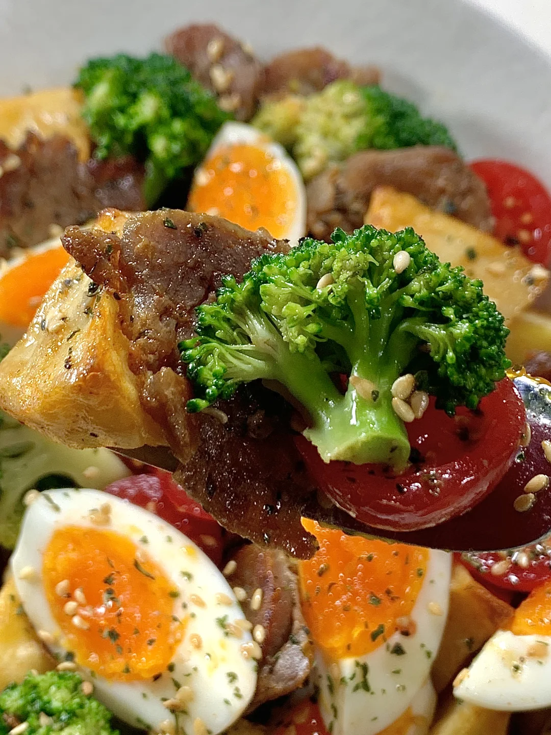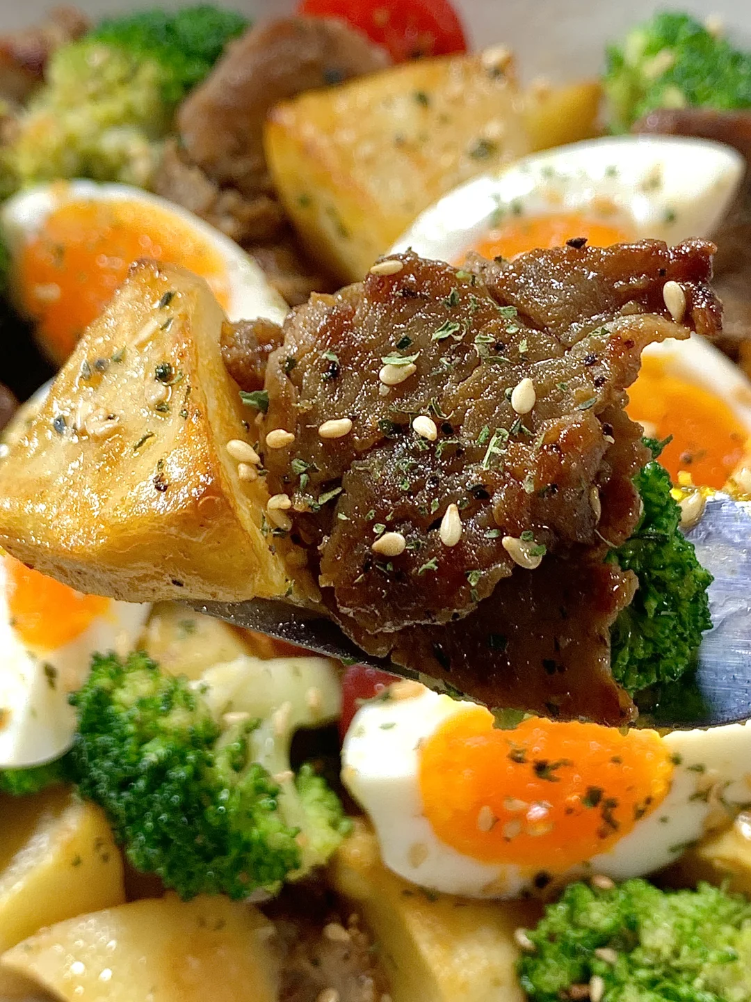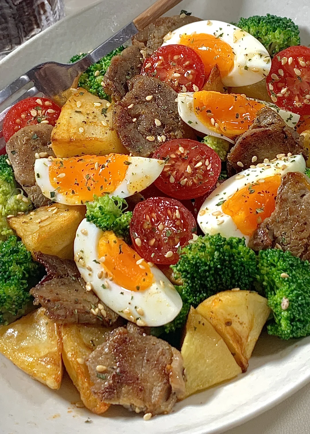 今天吃猪里脊烤土豆时蔬沙拉 饱腹感强 口感丰富,低卡高蛋白好吃还不月半! 搭配一杯热美式 做法快手简单、来get吧! 📝准备食材: 猪里脊、土豆、西兰花、圣女果、鸡蛋、海盐黑胡椒、辣椒粉、孜然粉、橄榄油、欧芹碎 🫕做法: 1️⃣猪里脊切片+生抽+蚝油+料酒+黑胡椒+玉米粒淀粉 腌制15分钟,煎熟备用 2️⃣西兰花和鸡蛋煮熟备用 3️⃣土豆切块+1勺橄榄油+辣椒粉+海盐黑胡椒+孜然粉 搅拌均匀 空气炸锅185℃烤20分钟(中途翻面) 4️⃣把准备的食材装盘,撒上海盐黑胡椒+白芝麻+欧芹碎 ✨今天用的猪肉是中粮家佳康亚麻籽猪 它家肉肉我买过很多次了,全产业链严苛管控 吃起来确实不一样,肉质很嫩,不腥也不柴 我还专门查过,他家肉肉含有丰富的α-亚麻酸 是他家普通猪肉的6倍以上! 这种优质脂肪就很适合老人和小孩吃,不用担心负担 我把它和蔬菜、土豆拌在一起,有肉有菜的,吃起来很满足[亲一个R] 做起来也简单,平时当午餐或者晚餐都挺合适的 大家可以试试看!