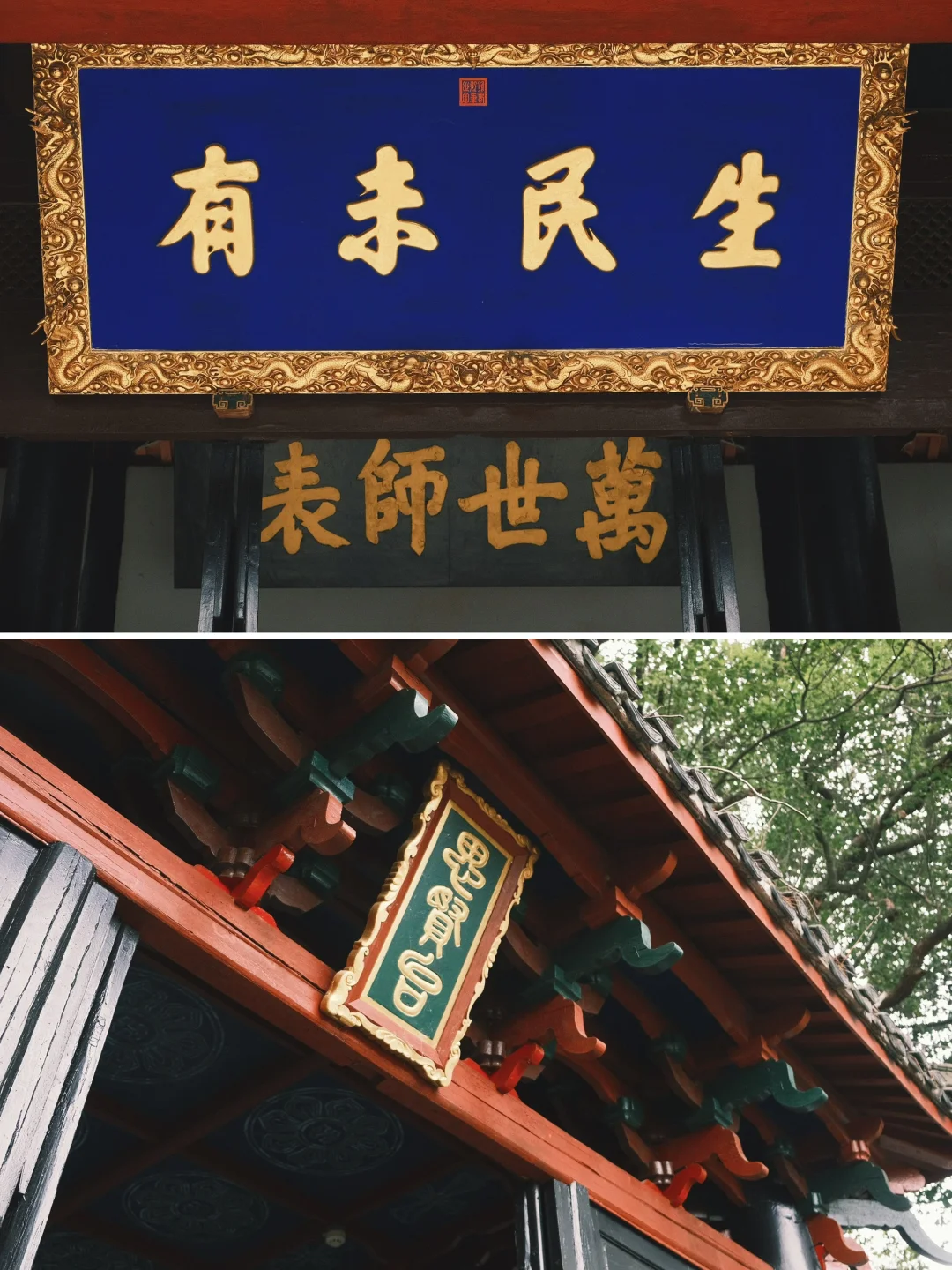 能看到①康熙御书“万世师表”匾;②朱熹手书“忠、孝、廉、节”四字