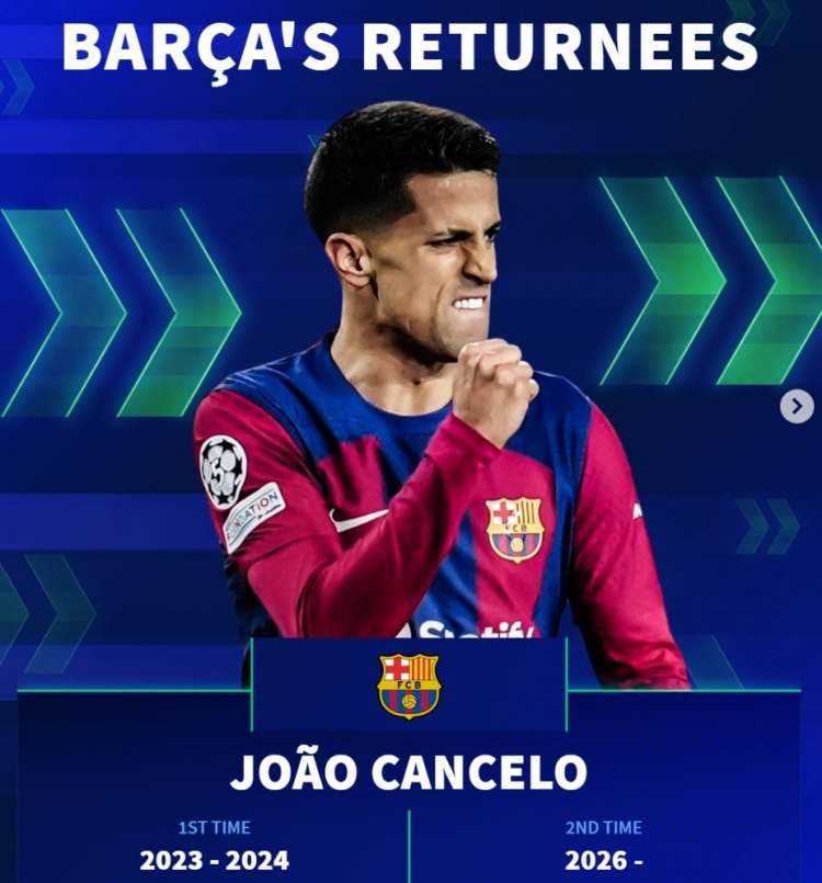 直播吧1月14日讯巴萨已经官宣租借引进利雅得新月边后卫坎塞洛,《转会市场》也列出了多位先后2次效力巴萨的球员。