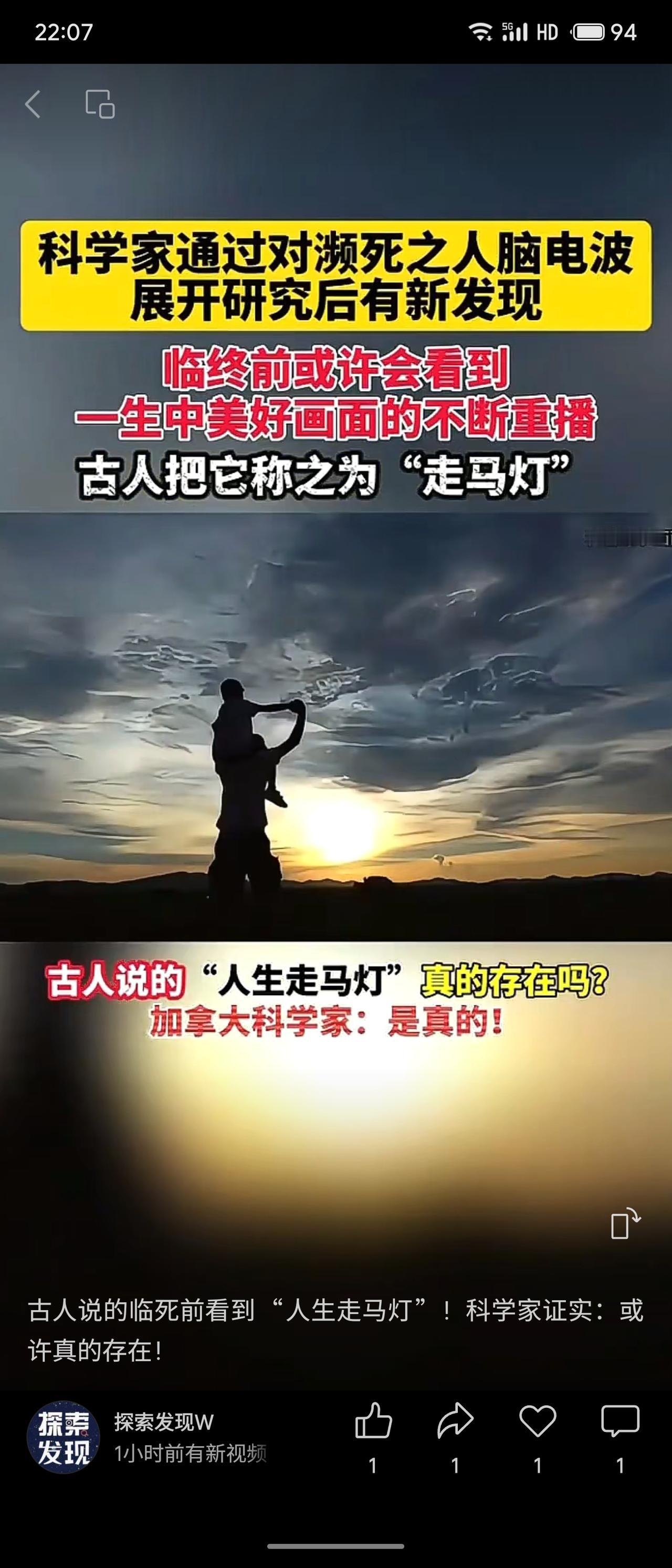 科学家通过对濒死之人脑电波的研究发现,人在临终前脑部可能重播一生中的重要或美好画面。这一现象印证了民间“走马灯”的说法,并已有加拿大科学家等研究证实其可能存在。