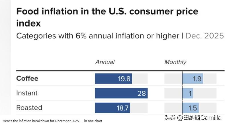 美国2025年12月的通货膨胀 由于食品杂货、外出就餐、公用事业天然气、服装及其他类别消费者支出面临价格压力,12月抑制通胀的努力似乎陷入停滞。美国劳工统计局公布,12月主要通胀指标消费者价格指数(CPI)较上年同期上涨2.7%,与上月持平,符合预期。穆迪首席经济学家马克•赞迪指出,主食和必需品的通胀依旧居高不下。 01. 关税推高通胀 美国央行美联储的长期目标是年均通胀率维持在2%左右。关税作为一种进口税,由美国进口商缴纳。经济学家预计,企业至少会通过提价将部分税收转嫁给消费者。赞迪称若没有关税,我们早就回到目标水平了。关税使通胀升高了半个多百分点。 02. 这对美联储是好消息 赞迪表示,总体通胀率高于表面数字。创纪录的长时间政府停摆从10月1日持续至11月12日,致使联邦统计人员无法收集10月典型通胀数据。若无这些数据,美国劳工统计局便会假定当月多数类别的商品和服务价格未上涨。穆迪估计,若纳入这些数据,CPI年通胀率将在3%左右。这或许是美联储决策者在考虑2026年是否放松利率政策时乐见的迹象。 03. 消费必需品引发负担能力担忧 负担能力已成为消费者关注的关键金融问题,12月部分家庭必需品通胀有所上升。例如,11月至12月,食品杂货和餐馆食品价格每月上涨0.7%。要使通胀回到目标水平,每月通胀率通常需控制在0.2%左右。过去一年,受供应紧张影响,咖啡和牛肉等特定品类通胀率颇高,分别约达20%和16%。 公用事业管道天然气服务价格本月上涨4.4%,全年涨幅达11%。当月电价下降0.1%,但全年上涨约7%。赞迪表示,积极来看,房地产可能在2026年和2027年起到平衡整体通胀的作用,租金增长依旧十分疲软。 CPI通胀数据 全球通胀潮 美国通胀 普通人应对通胀 11月通胀 生产者物价指数