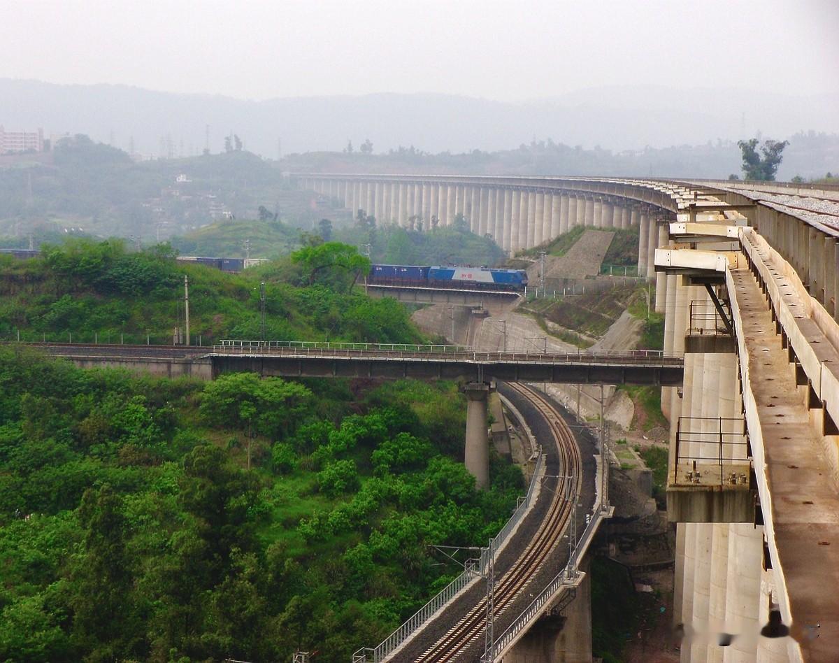 2014年4月在磨心坡铁路立交区拍摄的图片,这是三层铁路立交。右边最上边的是兰渝铁路刘家沟特大桥,当时还在施工中,还未架设接触网杆子。中间两条线是襄渝方向上行线,货车走的那条线是襄渝上行正线东阳线路所与磨心坡站区间,客车走的是襄遂联络二线黄桷线路磨心坡站区间。最下边的是襄遂货车联络二线石子山站与东阳线路所区间。 图中的兰渝线渭沱到重庆北北场后来算入沪蓉线,襄渝在磨心坡以南客货分线运行,遂渝和兰渝的货列进兴隆场编组站走最下边那条线。