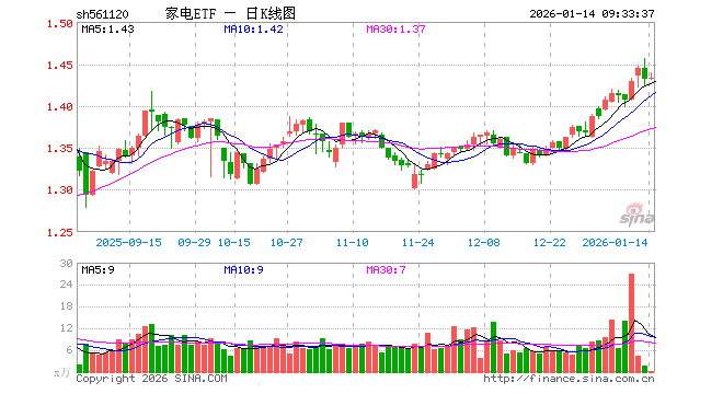 1月14日,家电ETF(561120)开盘涨0.00%,报1.431元。家电ETF(561120)重仓股方面,美的集团开盘涨0.00%,三花智控跌1.47%,格力电器跌0.05%,海尔智家涨0.27%,石头科技涨0.00%,四川长虹跌0.51%,麦格米特跌1.01%,科沃斯跌0.02%,海信视像涨0.92%,兆驰股份涨3.31%。