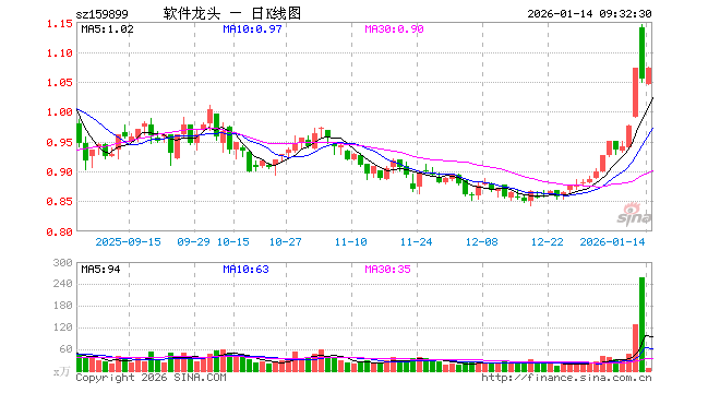 1月14日,软件龙头ETF(159899)开盘跌0.76%,报1.046元。软件龙头ETF(159899)重仓股方面,科大讯飞开盘涨0.61%,同花顺跌1.86%,金山办公跌0.22%,指南针跌0.87%,恒生电子跌0.55%,润和软件涨0.96%,三六零跌1.22%,拓维信息涨0.00%,用友网络涨2.14%。
