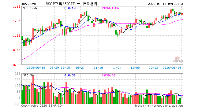 1月14日,MSCI中国A50ETF(560050)开盘跌0.09%,报1.070元。MSCI中国A50ETF(560050)重仓股方面,宁德时代开盘涨0.29%,紫金矿业涨0.97%,工业富联涨1.13%,贵州茅台涨0.00%,海光信息涨1.80%,寒武纪涨0.85%,比亚迪跌0.39%,恒瑞医药涨0.05%,立讯精密跌0.70%,中际旭创涨1.64%。