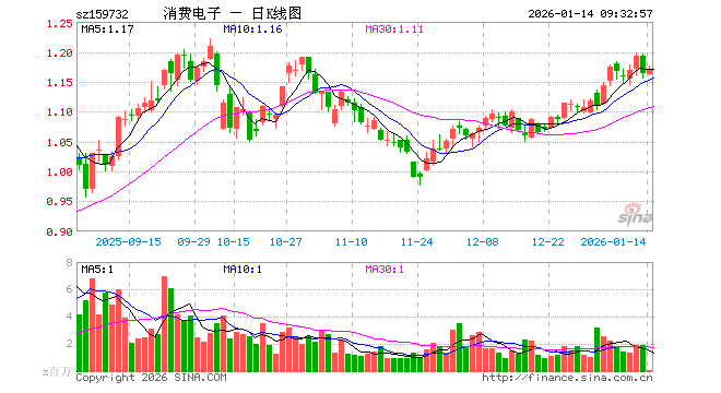 1月14日,消费电子ETF(159732)开盘跌0.09%,报1.162元。消费电子ETF(159732)重仓股方面,立讯精密开盘跌0.70%,胜宏科技涨1.22%,京东方A涨1.79%,兆易创新涨2.47%,豪威集团跌0.14%,歌尔股份涨0.69%,东山精密涨0.45%,TCL科技涨2.31%,蓝思科技涨0.94%,长电科技涨0.00%。