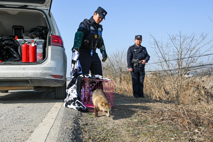 大皖新闻讯1月13日上午,马鞍山市和县公安局接到群众紧急求助,称在野外发现一只野生动物被防护网紧紧缠绕,无法脱身。民警迅速赶赴现场,确认受困的为国家二级保护野生动物貉。为避免对其造成二次伤害,民警小心翼翼地剪开缠绕的绳索,仔细检查确认其体表无外伤后,立即将这只貉带至适宜的野外栖息地,放归自然。