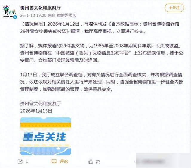 2026年1月12日,有媒体刊发《官方数据显示:贵州省博物馆老馆29件套文物丢失或被盗》报道,我厅高度重视,立即进行核实。