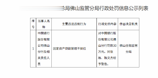 中国银行佛山分行被30万元:固定资产贷款管理不到位