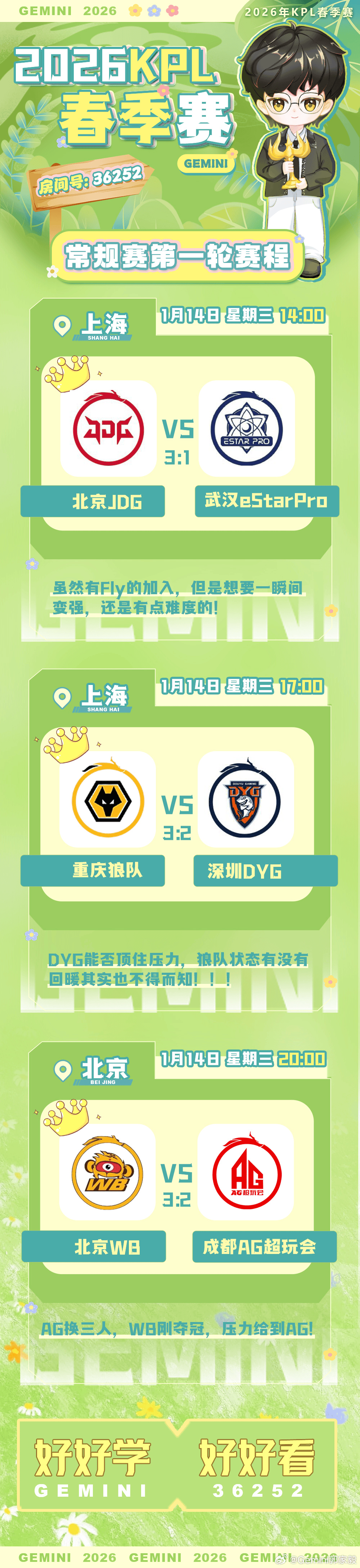 虎扑01月14日讯Gemini预测春季赛首日赛果:狼队3-2DYG,WB3-2AG超玩会