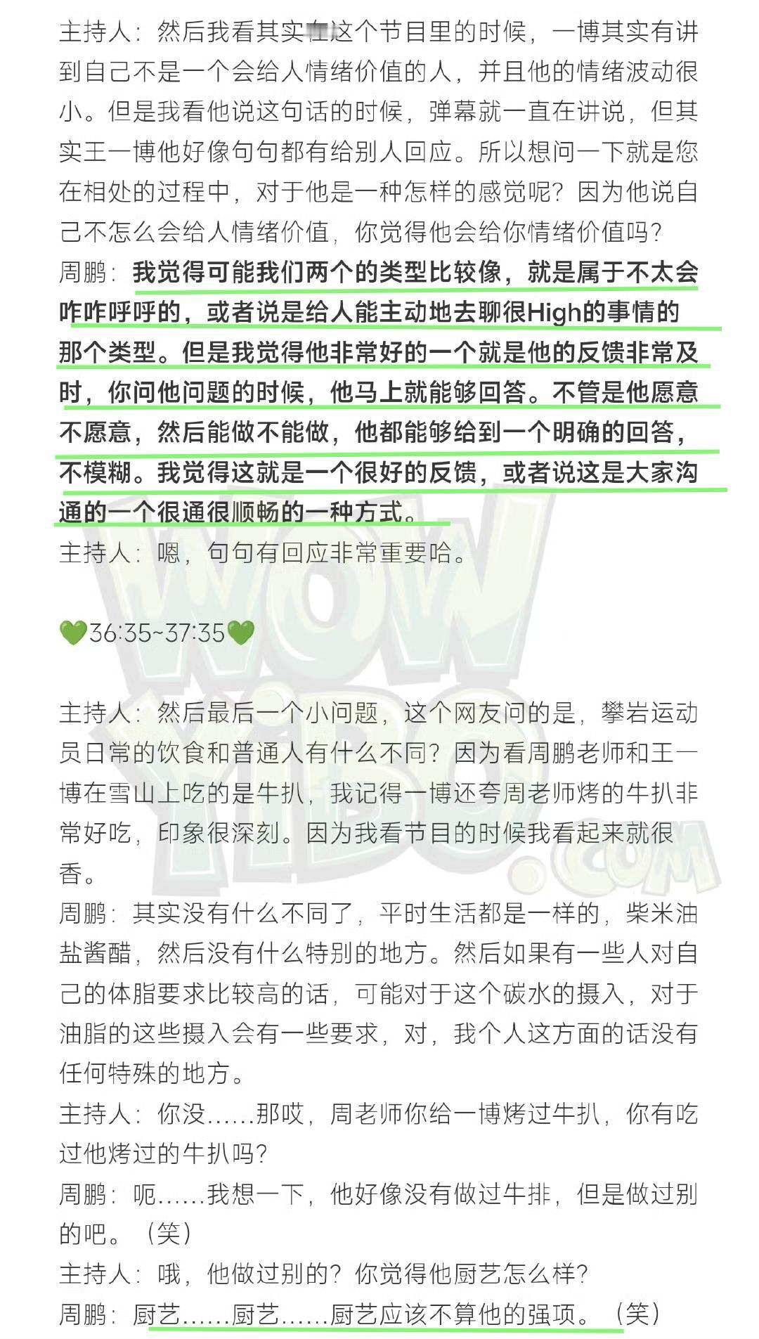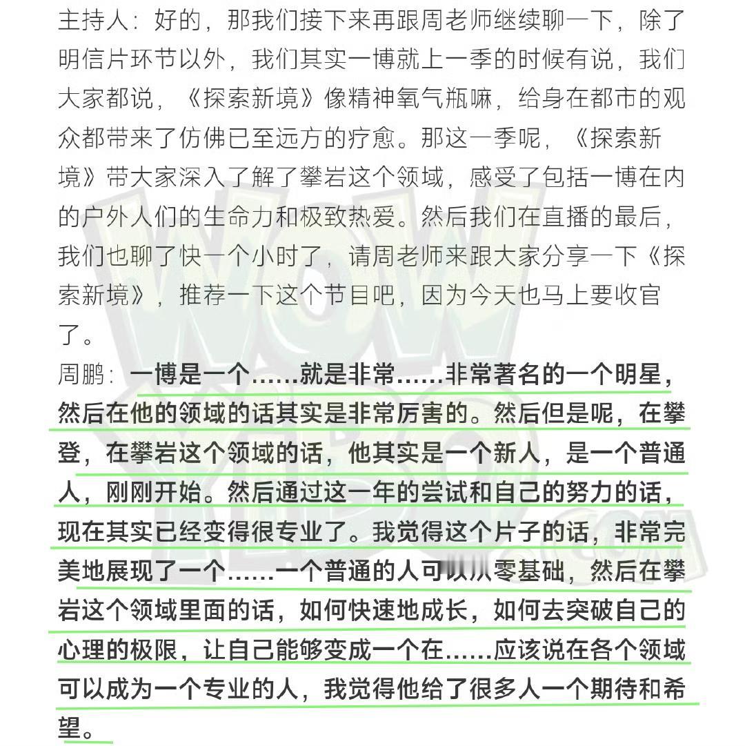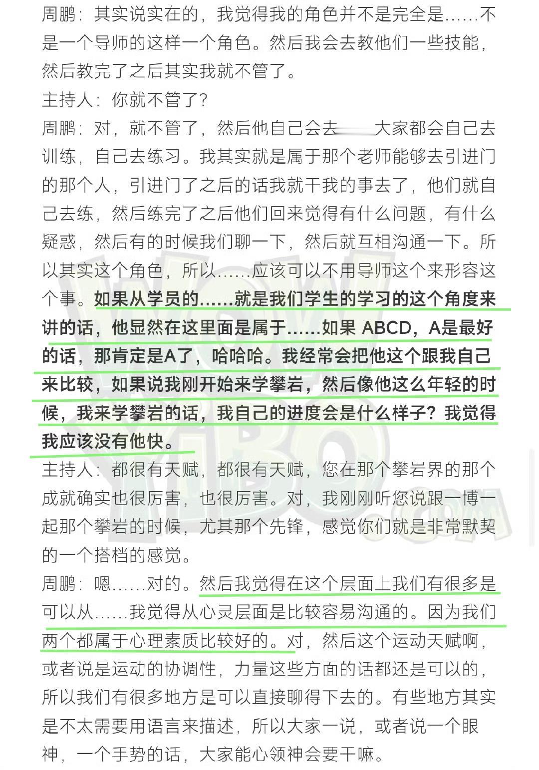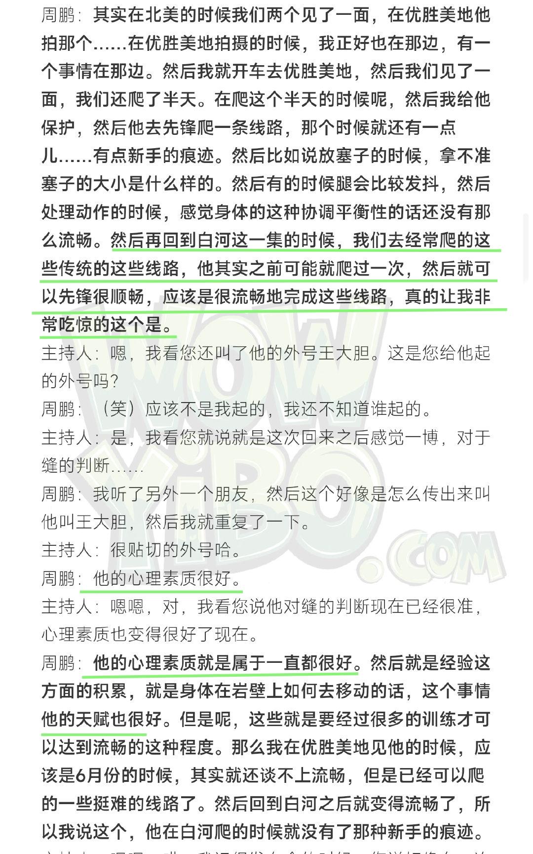 王一博的天赋、敬业、专业、努力和对热爱的坚韧,共事过的人最知道,也只有真正专业的人才清楚王一博的天赋有多惊人。 看看周鹏老师对王一博的评价: ——他的心理素质就属于一直都很好,天赋也很好。 ——从他练习的量和进步的速度比较来看的话,确实是属于超快的。这个超字的话一般我不太会用来形容,真的是很快。因为他平时的工作其实这些,是非常忙的,能够抽出来去攀岩的时间的话没有那么多。然后能够来野攀的时间的话其实就更少。 ——那像他这一年下来的话,现在可以传统的线路基本上可以on-sight(一次完攀)5.10ab,甚至可以到差不多5.10c这样的难度的话,这绝对算是一个非常非常快的进度了。就算是在我们的学员这个大的群体里面的话,到目前为止其实没有人有这么快。 ——如果从就是我们学生的学习的这个角度来讲的话,他显然在这里面是属于……如果ABCD,A是最好的话,那肯定是A了。 ——我经常会把他跟我自己来比较,如果说我刚开始来学攀岩,然后像他这么年轻的时候,我来学攀岩的话,我自己的进度会是什么样子?我觉得我应该没有他快。 “王一博 导师的梦中情徒”,这句话绝对名副其实。 只要是他热爱的,不管哪里领域,王一博都能做到闪闪发光,并且把“小众”真正带到“大众”的视野之中。 王一博