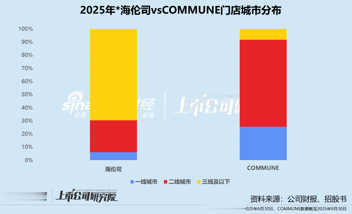 就门店分布而言,COMMUNE的“基本盘”是一线及二线城市。2023-2025年前三季度,其一线城市的门店数量从18家涨至28家,二线城市门店数量由61家涨至72家,期间合计占门店总数比例分别为88.8%、91.4%、91.7%。而海伦司2021年上市后便全力开拓下沉市场,巅峰时期三线及以下城市平均每周落地3-4家新店。截至2025年6月30日,其运营的583家门店中,近七成位于三线及以下城市,一线及二线城市门店数量较2021年净减少65.8%。