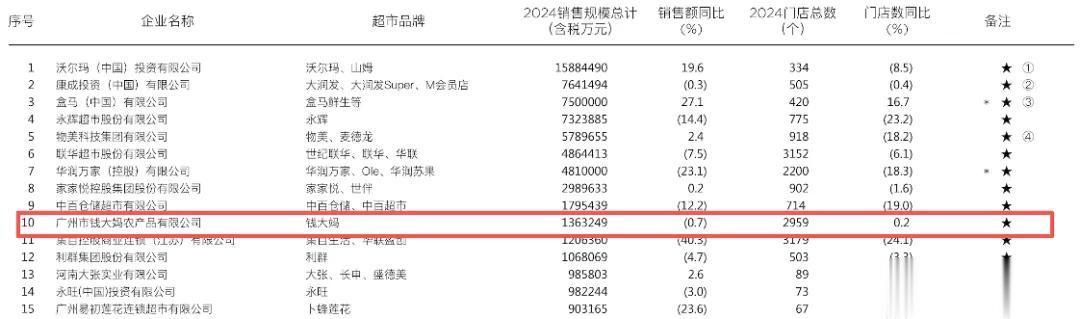 2025年中,中国连锁协会曾经发布过中国商超的排名,钱大妈的销售额排到了第10位,超过了永旺、卜蜂莲花等众多耳熟能详的老牌商超,排在钱大妈前面的分别是沃尔玛(沃尔玛、山姆)、康成投资(大润发)、盒马、物美、华润万家等。