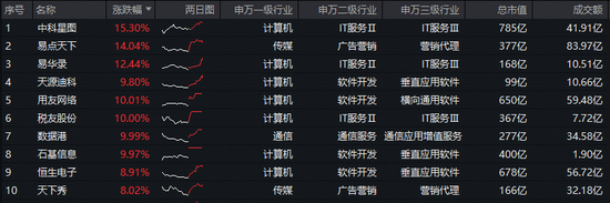 成份股方面,用友网络、税友股份、数据港、石基信息4股涨停,中科星图涨超15%,易点天下涨逾14%,易华录涨超12%,恒生电子、天下秀等个股大幅跟涨。