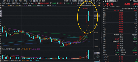 重点布局算力、AI应用领域的大数据ETF华宝(516700)继周一ETF涨停,周二创历史新高后,周三(1月14日)继续强势冲锋,场内涨幅盘中上探6.45%,现涨4.01%。