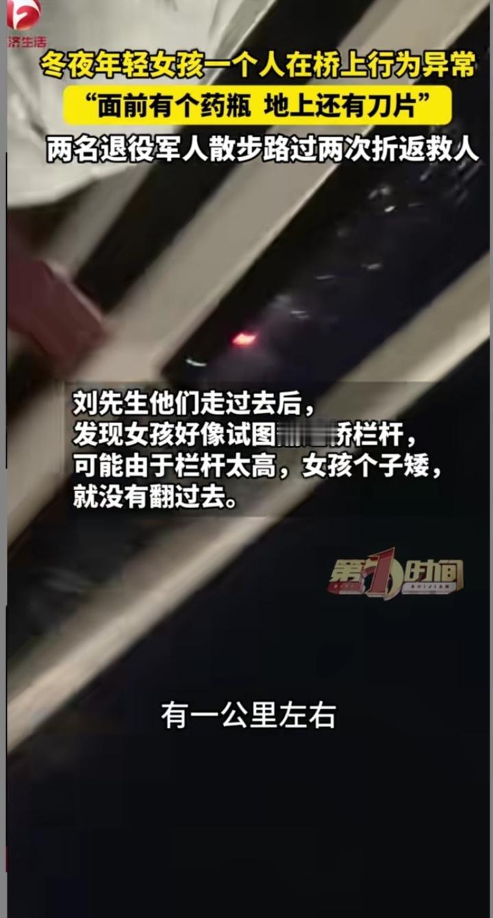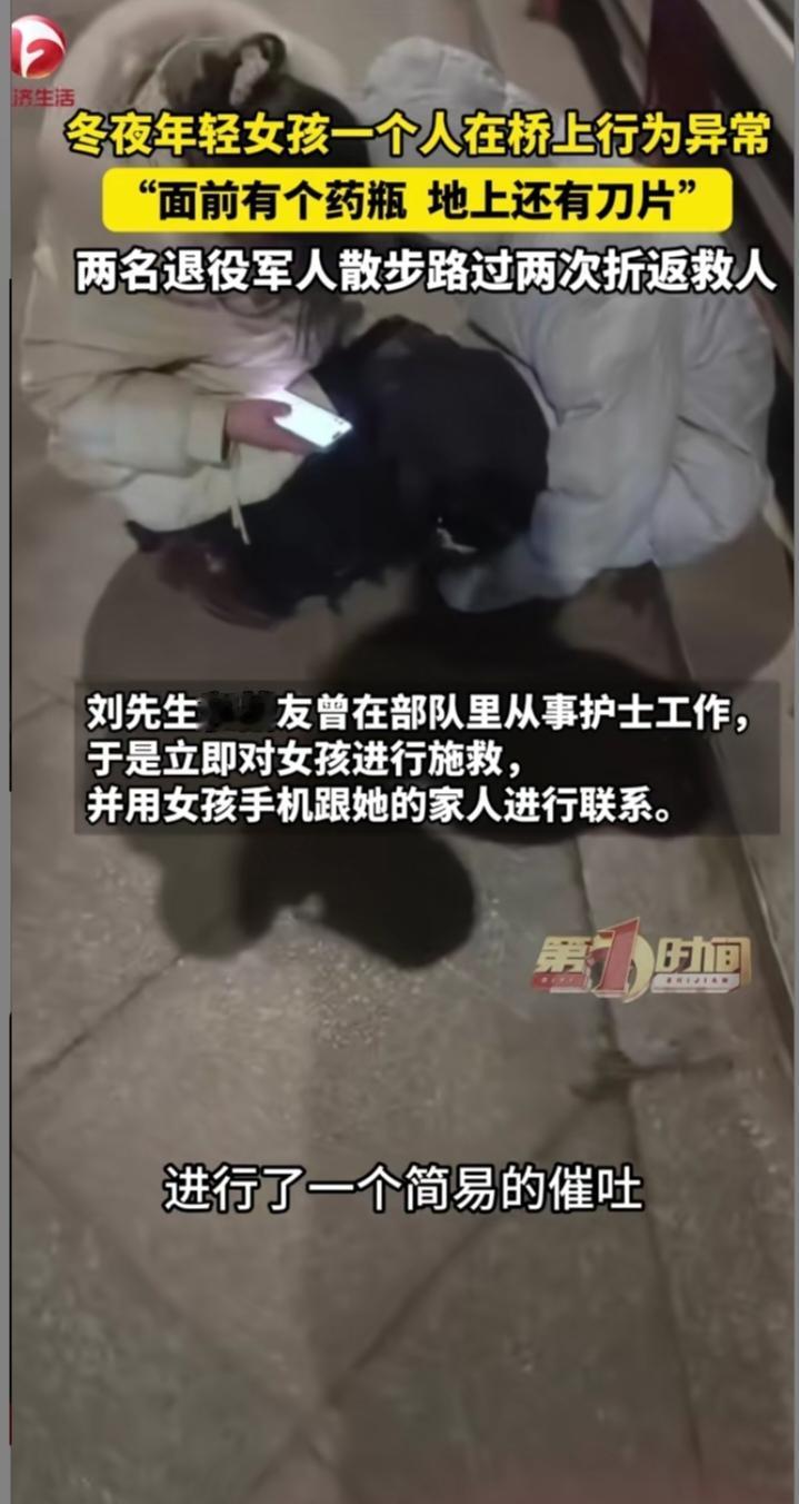 退役军人两次折返救17岁轻生女孩 2026年1月11日晚8时许,山东德州两名退役军人刘先生与战友散步时,发现一名17岁女孩在桥上行为异常,其脚边散落着空药瓶与刀片。 初次询问遭女孩拒绝后,二人前行一公里仍放心不下,果断折返,发现女孩正试图翻越护栏。凭借部队护士工作经验,他们立即对瞳孔呈针尖状的女孩实施简易催吐急救,同时联系其家人并报警。 目前女孩已脱离生命危险,其母亲已向救人者致谢。刘先生表示,“退役不褪责,这是军人的本能与担当”。