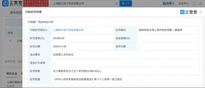 直播吧1月14日讯 企查查APP显示,近日,EDG电竞俱乐部关联公司上海阳川电子科技有限公司因“在账簿上多列支出”被国家税务总局上海市税务局第一稽查局行政处罚,处罚结果为“处少缴税款百分之五十的罚款5.3万余元”。该公司由朱一航担任董事长,潘逸斌担任法定代表人、总经理等。