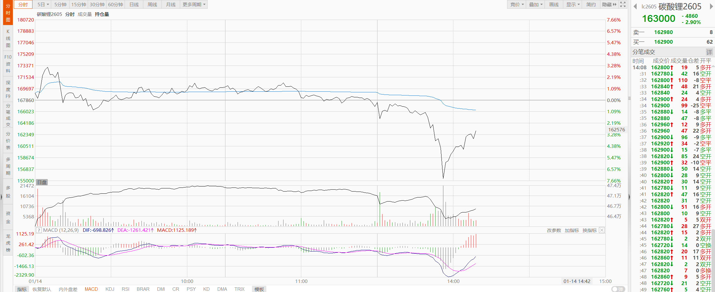 1月14日下午,碳酸锂期货盘中跳水,主力合约碳酸锂2605一度跌超7%,引发市场对锂矿行业的担忧。截至目前,碳酸锂2605价格快速反弹,跌幅收窄至3%左右。