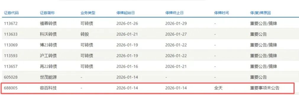 1月14日,容百科技停牌1天,原因是有重要事项未公告。